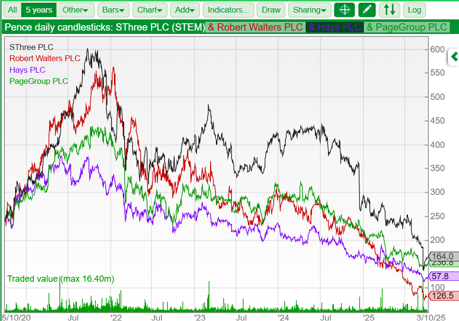 SThree (STEM) slashed its forecast profit for next year (11/2026) from £30m to £10m. So there seems no sign of any recovery in this absolutely battered sector. Bargains galore for a cyclical recovery, or are companies using other methods to recruit? I’m not sure. Look at the 5-year share price chart for STEM below, which I’ve compared with sector peers RWA, PAGE, and HAS