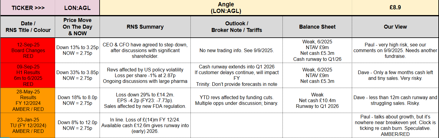 Angle (AGL) – we warned on cash burn, with AMBER/RED on 23/1/2025 at 12.0p. It’s now only 2.75p. Another disastrous cash-burning blue sky project. These things hardly ever work, so we’ll continue warning people away from story stocks that are not viable businesses. It’s been the biggest leak in my portfolio long-term, believing stories, and then watching the shares just wither away, and being too stubborn to throw in the towel – often actually compounding the losses by throwing new money after old.