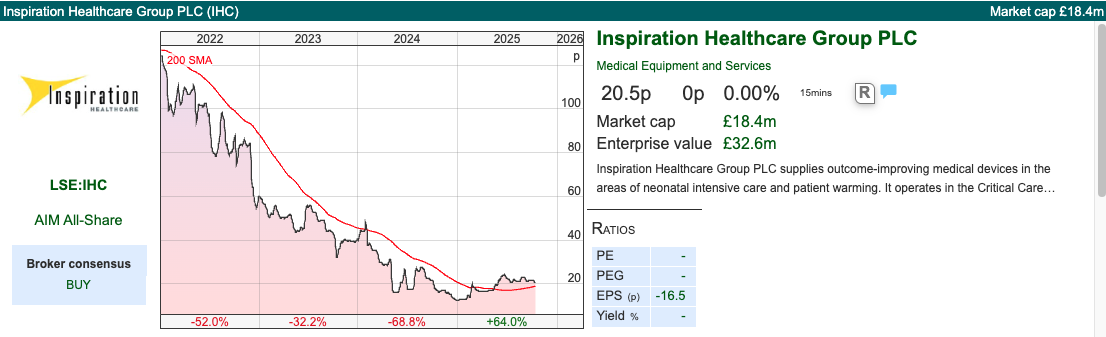 The IHC investment case was pitched at Mello as a turnaround in July last year by Paul Hill, when the share price was 17p. That was just after management had done a rescue placing at 14p per share, a discount of 43% to the then share price. The shares fell back to 13.5p on the last day of 2024, but are now up +64% YTD. That rescue placing raised £2.5m gross was caused by a difficult 2023: contract / regulatory delays, combined with inventory destocking. Revenue fell -9% FY Jan 2024 to £38m, resulting in a £6m loss that year, followed by a £16m loss FY Jan 2025. Despite those hefty losses the balance sheet doesn’t look terrible: net debt stood at £7m at the end of this July and is expected to improve further in the next 6 months, according to Paul Hill’s discussion with management.