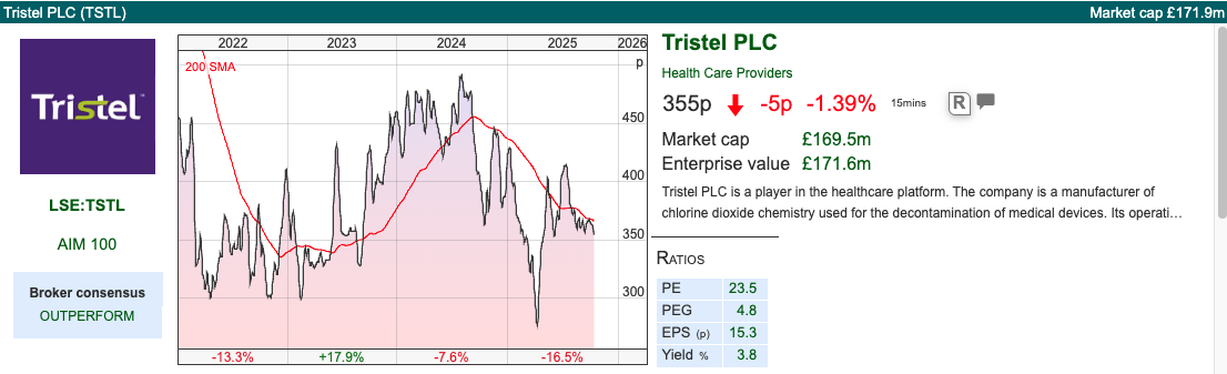 Staying with the medical sector, this chlorine dioxide to clean medical devices has tended to trade at premium valuation (PER above 30x, and between 5-10x sales) justified by hopes of expansion into the US market. That seemed to be bearing fruit, but then the shares fell by a third after Trump’s April tariff announcement. The share price recovered lost ground as the UK trade deal was announced, but remains below its 200 day moving average. There’s been a significant de-rating, I last wrote about it in mid 2023, when the share price was the same level as it is today.