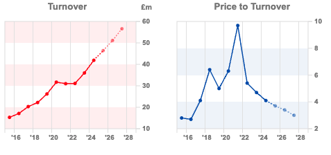 Performance against targets: Around the time of the capital raising management announced medium term financial targets in its 2026 financial year. These included: i) revenue to grow to c. £180m (net of selling non core businesses) v $190m forecast FY Mar 2026F rising to $199m FY Mar 2027F. NB the revenue target was announced in pounds, but the group changed both its reporting currency to dollars and year-end. FY Mar 2027F is likely the most appropriate 12M. ii) Gross margins of c.40% versus 36% reported FY Mar 2025 at the end of June. Iii) Underlying EBIT margins >10% versus 5% forecast FY Mar 2027F.
