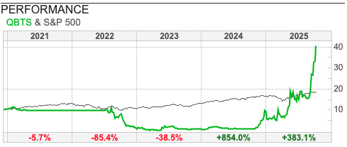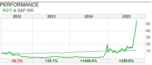 See also Rigetti (RGTI) below. He told me about these companies a year ago, and I spent some time on YouTube learning about quantum computing, for instance Grover’s Algorithm. I concluded that quantum computers were mostly hype – which could be true, but the charts disagree. Can’t win them all.