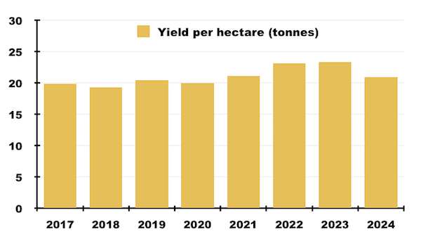 Yield per hectare has bobbed between 19 and 23 tonnes of crop during the last few years, and therefore does not obviously appear to have prompted that recent profit surge: