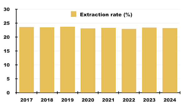 Another measure reported to shareholders is ‘extraction rate’, which reflects the amount of oil produced from each tonne of crop harvested. This rate has been very steady at approximately 23% for some years: