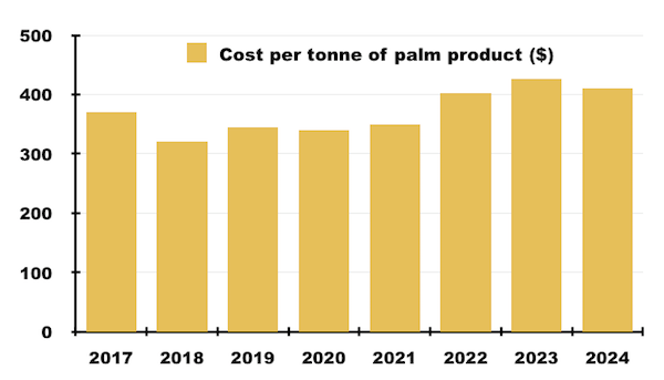 ‘Cost per tonne of palm product’ is, according to MP, a “key determinant of profitability” and has crept beyond $400 during the last few years: