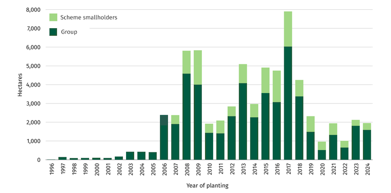 Another factor to consider is the improved maturity of MP’s plantations. This chart confirms the group undertook lots of new planting between 2008 and 2018…