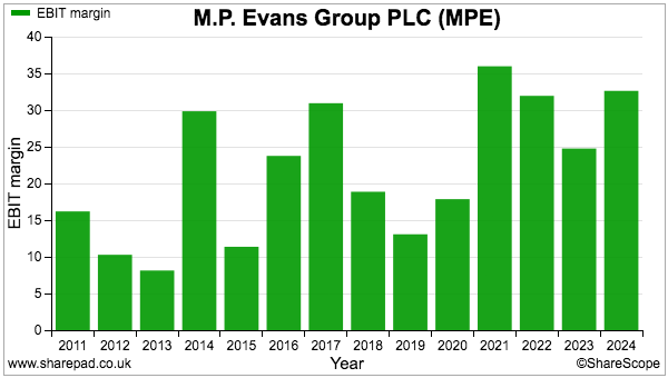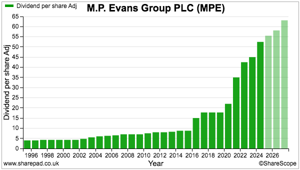 I selected MP Evans primarily because the company has never cut its dividend during the last 33 years: