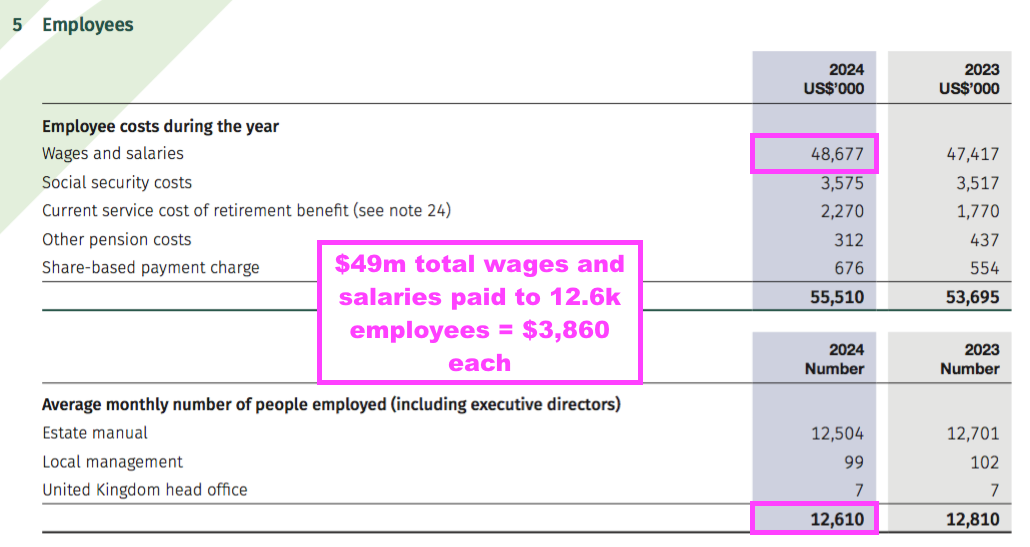 Note the vast majority of MP’s employees are Indonesian plantation workers and the average group salary is less than $4k: