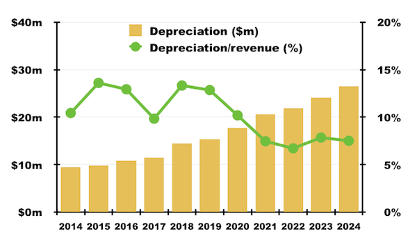 After employee costs, MP’s next-largest disclosed expense is depreciation, which during recent years has reduced from more than 12% to less than 8% of revenue: