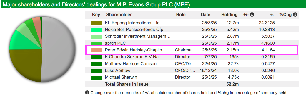 Peter Hadsley-Chaplin still owns a useful 4% stake valued at approximately £28 million: