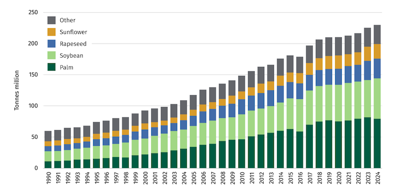 Palm oil is the most popular of the four major vegetable oils, with almost 80 million tonnes produced during 2024 of which 57% were from Indonesia. Since 1990, worldwide demand for vegetable oils has increased at an average 3% a year, with palm-oil usage growing at 6%: