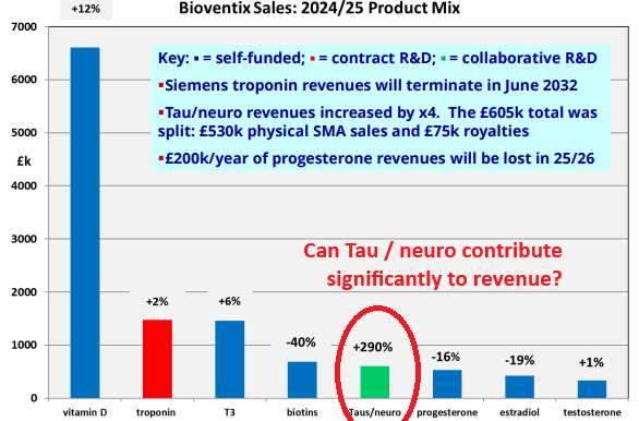 Reflecting that uncertainty, Cavendish their broker, have only now introduced FY Jun 2026F estimates, showing revenue declining -5% y-o-y and EPS down -6% to 136p FY Jun 2026F. The dividend of 150p is uncovered, presumably the analyst would have talked with management and they are comfortable with that. Possibly management wish to signal that the Alzheimer’s Disease tau/neuro antibody diagnostic sales, which increased four-fold from a low base, could make a significant contribution in future years, so they feel that the dividend is sustainable?
