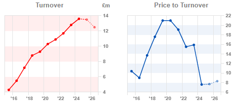 Valuation: The shares are trading on a PER of 14.4x June 2026F and 10x EV/EBITDA the same year. ShareScope’s mini charts show that at their peak the shares were trading on above 20x revenue, versus around 8x now.