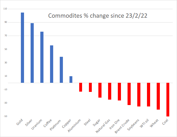 I continue to keep an eye on longer term trends in commodities, as it seems odd to me that precious metals have done so well when energy and food prices have remained subdued. The chart below using Sharescope data shows the best and worst performers since Putin’s invasion of Ukraine. I suppose gold was obvious in retrospect, but it’s fascinating that energy prices: Natural Gas -25%, Oil (both Brent Crude and WTI) -35% and food (wheat and soybeans) are down around -40%.