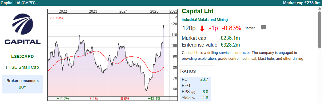 Opinion: This has doubled since April, but worth noting that for the preceding 3 years the share price was dull even as gold glistered. I think CAPD have significant potential, and ought to be less risky than buying shares in gold miners directly. Annoyingly, this is another one I bought too early but I will continue to hold.