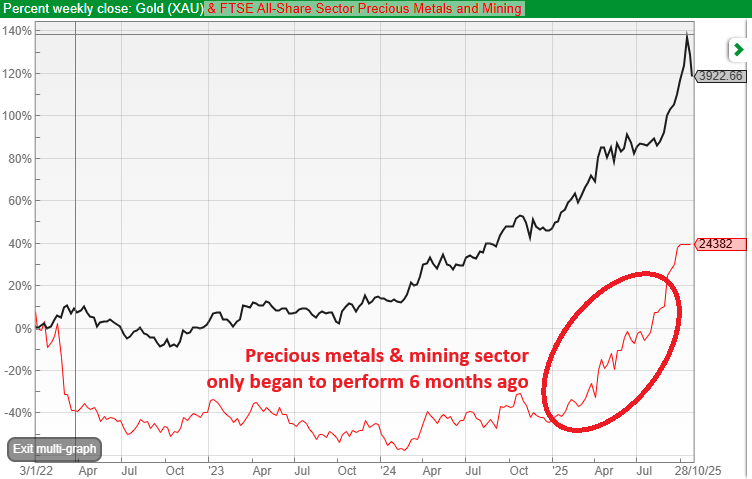 Below ShareScope’s “multi-graph” feature shows that the FTSE Precious Metals sector has lagged the rising price of gold for a couple of years, and mining shares only really began to start performing six months ago, when the gold price had already risen by +70% from the beginning of 2023.
