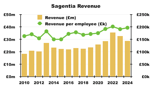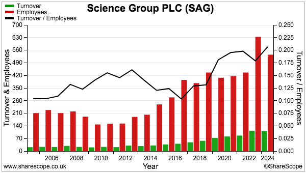 My own calculations for Science’s main subsidiary — the original Sagentia business — show revenue per employee gently improving towards a worthwhile £200k: