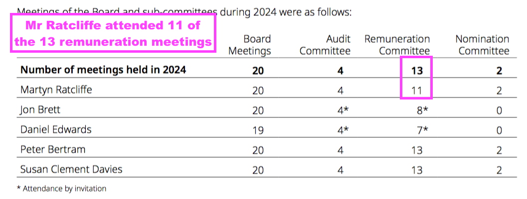 I get the impression staff pay is very important to Mr Ratcliffe. Despite not being a member of the remuneration committee, Mr Ratcliffe sat in on 11 of the 13 rem-comm meetings last year (and seemingly all without invitation):