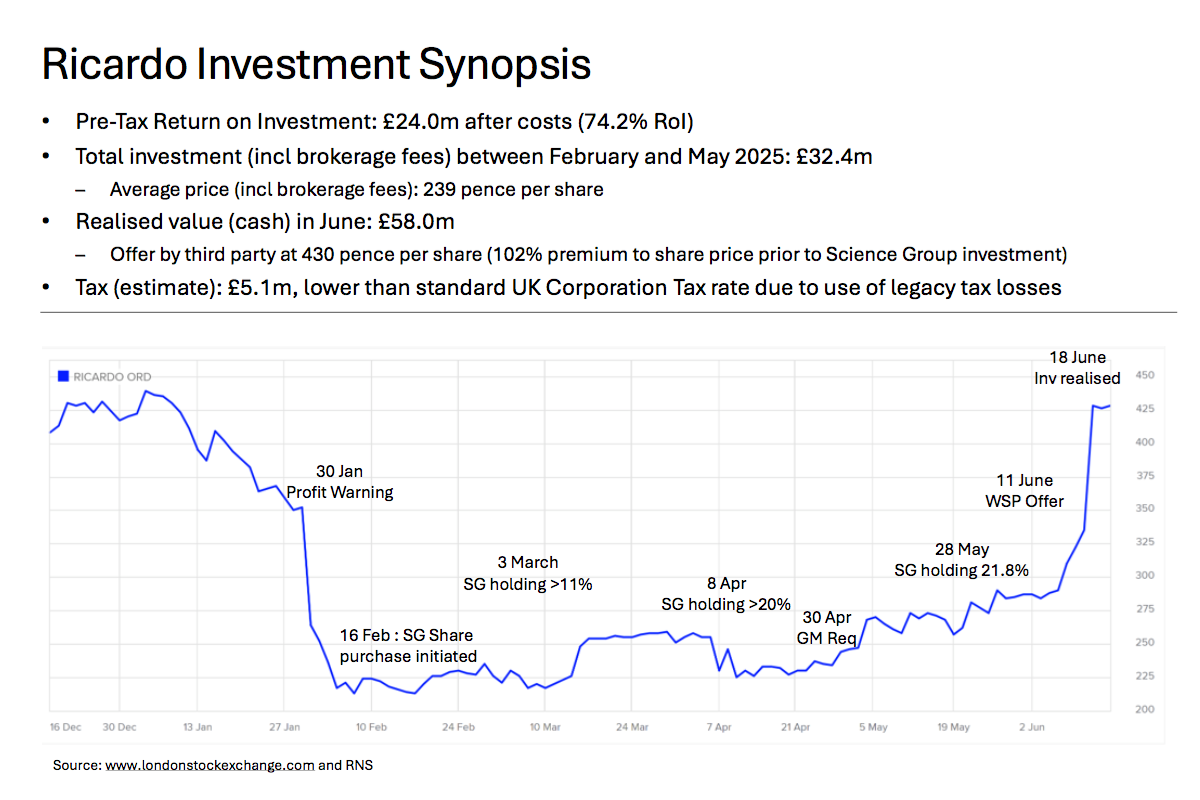 “Following poor operating performance and ineffective governance at Ricardo, resulting in a significant destruction of shareholder value, on 30 April 2025 Science Group requested the Ricardo Board to requisition a general meeting (“General Meeting”) for Ricardo shareholders to consider a single resolution to remove Mr Mark Clare as a director of the Company and Chairman of the Board.
