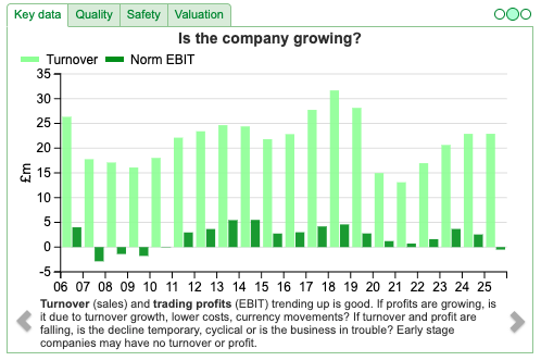 In July this year they signed an agreement to dispose of surplus land at the Group’s headquarters for a total of £7m. There was a £3.4m exception gain on property disposal (cash received was £4m) recorded in this H1, without which statutory LBT would have been £890K, versus PBT £815K the previous H1 Sept 2024. The remaining £3m cash payment is due in March 2026. Management don’t bother to split out this exceptional gain in the financial highlights to reveal a £1.7m negative swing in operating profits versus H1 last year.