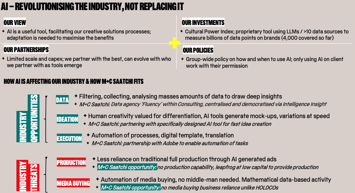 Both M&C Saatchi and Sir Martin Sorrell’s S4 Capital put out profit warnings at the start of the week. It’s hard to believe that AI is not going to create more losers than winners, in the way that high street travel agents, physical book and music shops selling Pink Floyd albums became a thing of the past. In response to investor concerns, management have claimed that AI is a useful tool, which they can adapt to and benefit from.