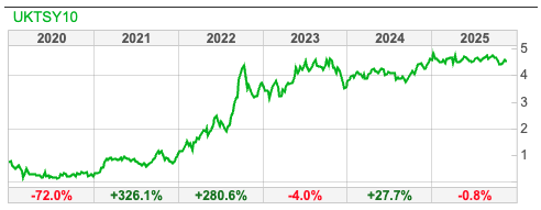UK Government debt is currently 103% of GDP, compared to 125% in the USA and 230% in Japan. Something I was unaware of, until recently, is that the UK has index-linked just under a quarter of its government borrowing. Goldbugs tend to assert confidently that governments will “inflate away their liabilities”, but that will be much harder when a quarter of the debt outstanding is inflation protected. Hence, the Chancellor’s emphasis on getting UK inflation under control while UK 10 year gilt yields are above 4.5%. Former hedge fund manager Russell Clark suggests that bond yields will continue to rise across most developed economies, at which point governments will need to choose between policies favouring either workers or large corporations.