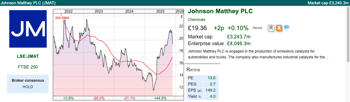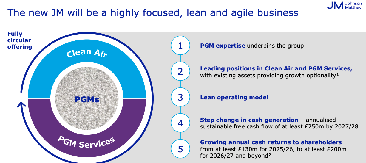 Following the disposal, JMAT will be focused on Clean Air (FY Mar 2025 sales £2.3bn, operating margin 11.8%) and PGM Services (Platinum Group Metals, FY sales £0.48bn, operating margin 31.4%). The former is mainly diesel catalytic converters for internal combustion engines, so is cash generative but vulnerable if Electric Vehicles sales accelerate. The chart above shows that this division (in blue) was expected to slowly shrink, and last week’s RNS reveals sales down -7% y-o-y, but operating profit up +11% as the margin improved to 12.4%.