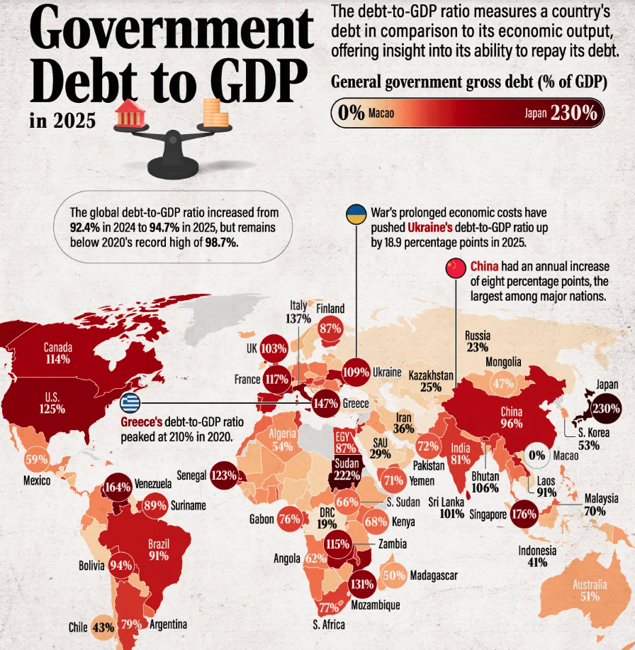 The FTSE 100 ended flat over the last 5 trading days, and is now up +17% YTD. The Nasdaq100 and S&P500 also recovered strongly at the start of the week, after an earlier sell-off, were up c. +0.5% over the same time period. Bitcoin continued to fall though and is now down around -30% from its early October peak to $87K. UK Government bond yields have also been volatile over the last couple of months, which seems to be driven by uncertainty about this week’s budget. In the spirit of the budget, I have been looking into international comparisons of Government debt, on sites like The Visual Capitalist.