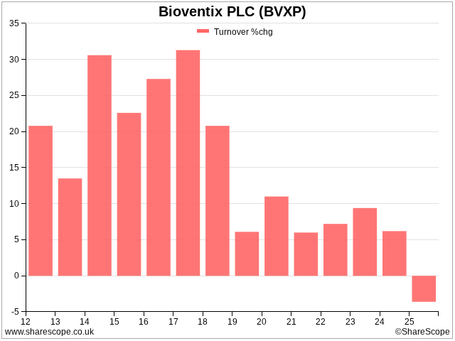 Historically, Bioventix’s ability to pick successful antibodies has achieved rapid growth as well as strong returns, however turnover growth has slowed and in 2025 it turned into contraction: