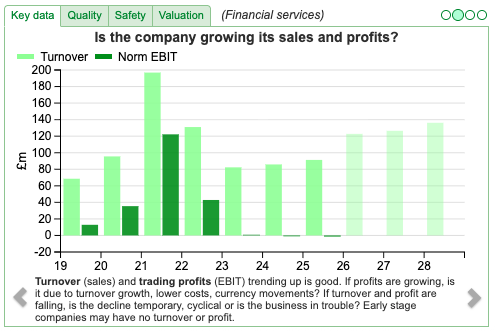 Cashflow: One area to note is that although profits are up strongly, cash from operations is down by a third to £435K. Partly that’s driven by a £13m net increase in securities held for trading. However, Sharescope fundamental data suggests that the group hasn’t generated meaningful free cash flow since 2021.