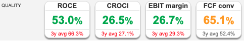Valuation: The shares are trading on a PER of 18x Jul 2027F and EV/EBITDA of 12x. That’s before the EPS upgrades flow through, so perhaps 16x-17x is likely the new multiple. The gross margin is 46%, in line with what SIS was reporting, but APN has a better track record of converting that gross margin to EBIT margins, as Sharescope’s quality indicators reveal.