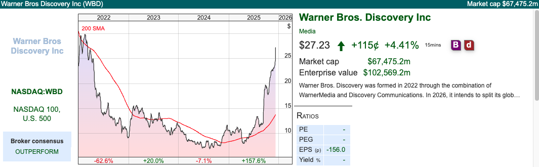 In the US, Netflix and Paramount have launched bids Warner Bros. Discovery. The two bids aren’t quite equivalent, so despite Paramount offering a higher price per share than Netflix’s offer, WBD’s board has recommended Netflix’s offer. When you see these types of competitive and hostile bid situations, for instance Royal Bank and Barclays bidding for ABN Amro, it tends to indicate we are within six months of a market top. That’s probably true of US markets, though definitely not AIM.