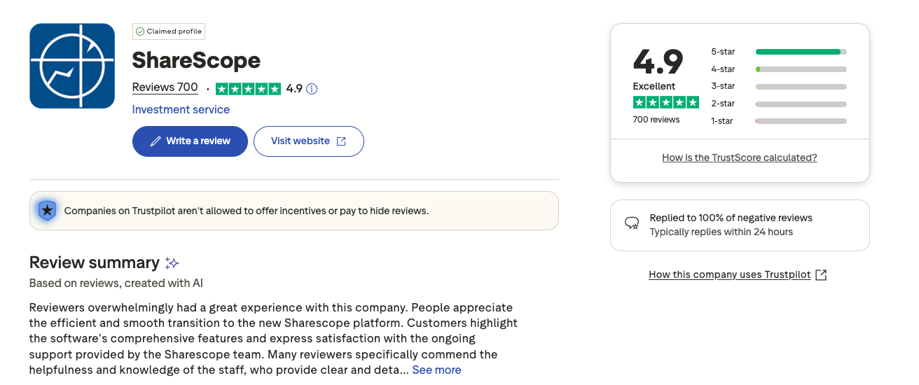 Maynard wrote up Trustpilot’s business model a couple of years ago. At the time, ShareScope didn’t pay Trustpilot, yet we still had overwhelming positive reviews (2 out of 358 were below 3 stars). Now ShareScope has 700 reviews, with the rating 4.9 which is “excellent”.