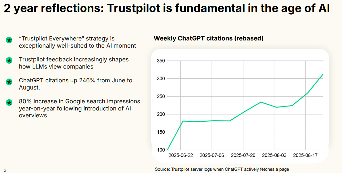 More generally though, there is a risk that AI disrupts the TRST business model. That’s definitely a possibility, but TRST’s reviews ought to be valuable for AI, as long as they have been written by real customers. That’s certainly the story management are trying to tell with this slide from their H1 June results (published in September).