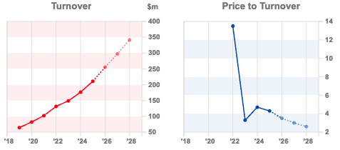 Valuation: The difference is that TRST trades on 36x PER Dec 2026F, dropping to 28x the following year. They are on 3x sales (de-rating from mid teens price/sales a couple of years ago, as the Sharescope chart below shows) and 16x EV/EBITDA Dec 2026F.