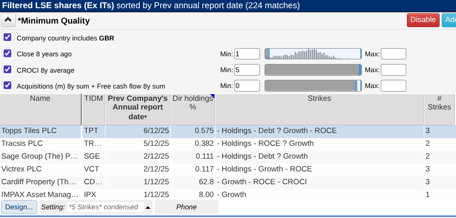 Today, there are 1,208 shares in the “LSE shares Ex ITs” list, and 208 shares pass my Minimum Quality Filter. Here is a screenshot he shares that have passed and published annual reports since my last update: