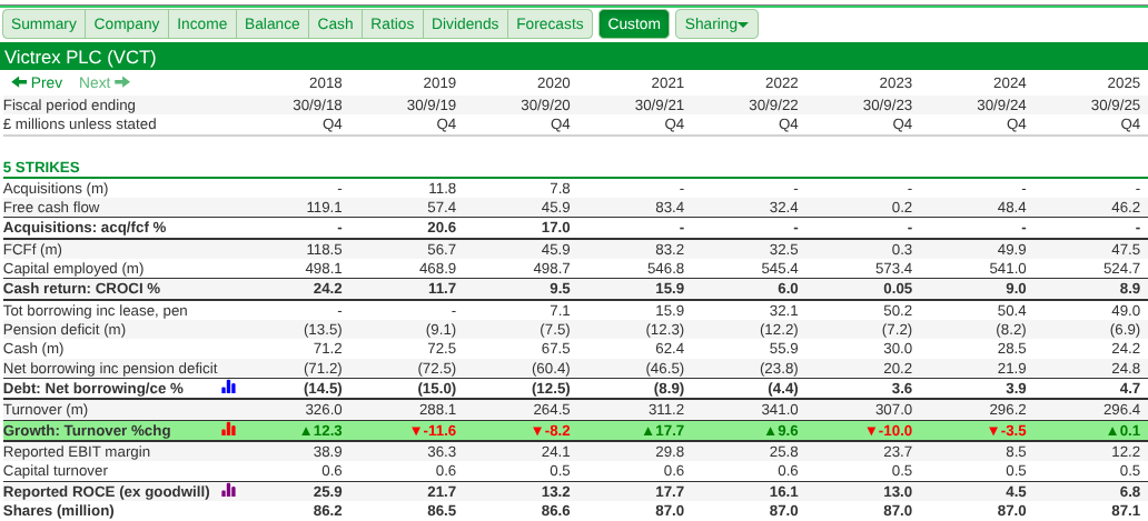 Growth is the big conundrum at Victrex. It is investing, but not generating growth. Turnover has been very up and down during the period and it was lower in 2025 than it was in 2018. I can tolerate lumpy growth but do not like to see many or heavily negative years, or a flat or negative trend.