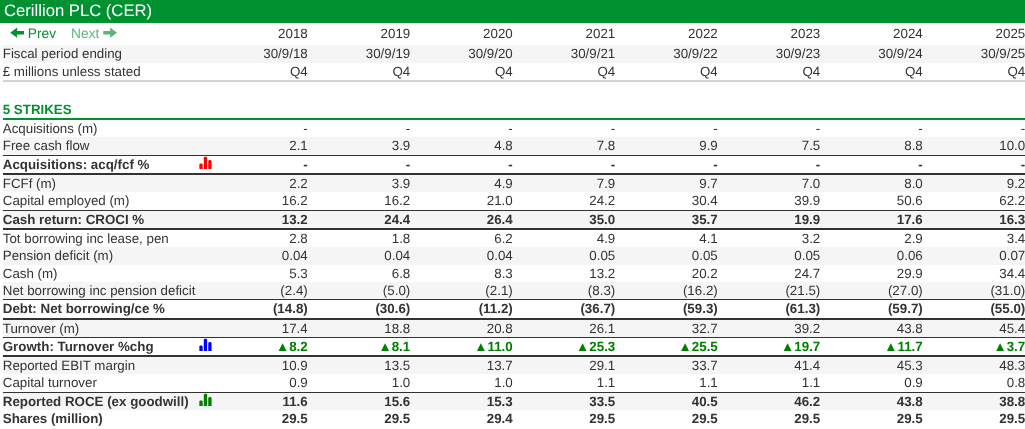 The only criterion Cerillion passed marginally in 2025 was turnover growth of 3.7%. If it had contracted I’d have awarded a strike and perhaps wondered whether some of my doubts were weighing on its performance.