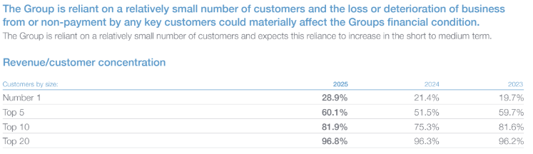 The third risk may be a consequence of the second. Cerillion already serves very big customers and customer concentration increased in 2025. When your biggest customer brings in 29% of revenue and the top 5 bring in 60%, the loss of a customer could have a very severe impact: