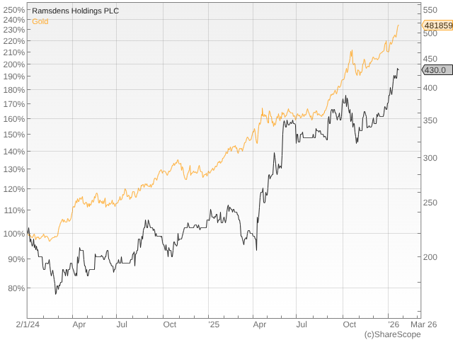Ramsdens is in roughly equal measure a pawnbroker, a buyer and seller of precious metals, currency exchanger, and jewellery retailer. The share price took off in 2025, at least in part because gold prices did too. Ramsdens is sitting on appreciating gold stock, and the collateral against its pawnbroking loans is often gold too.