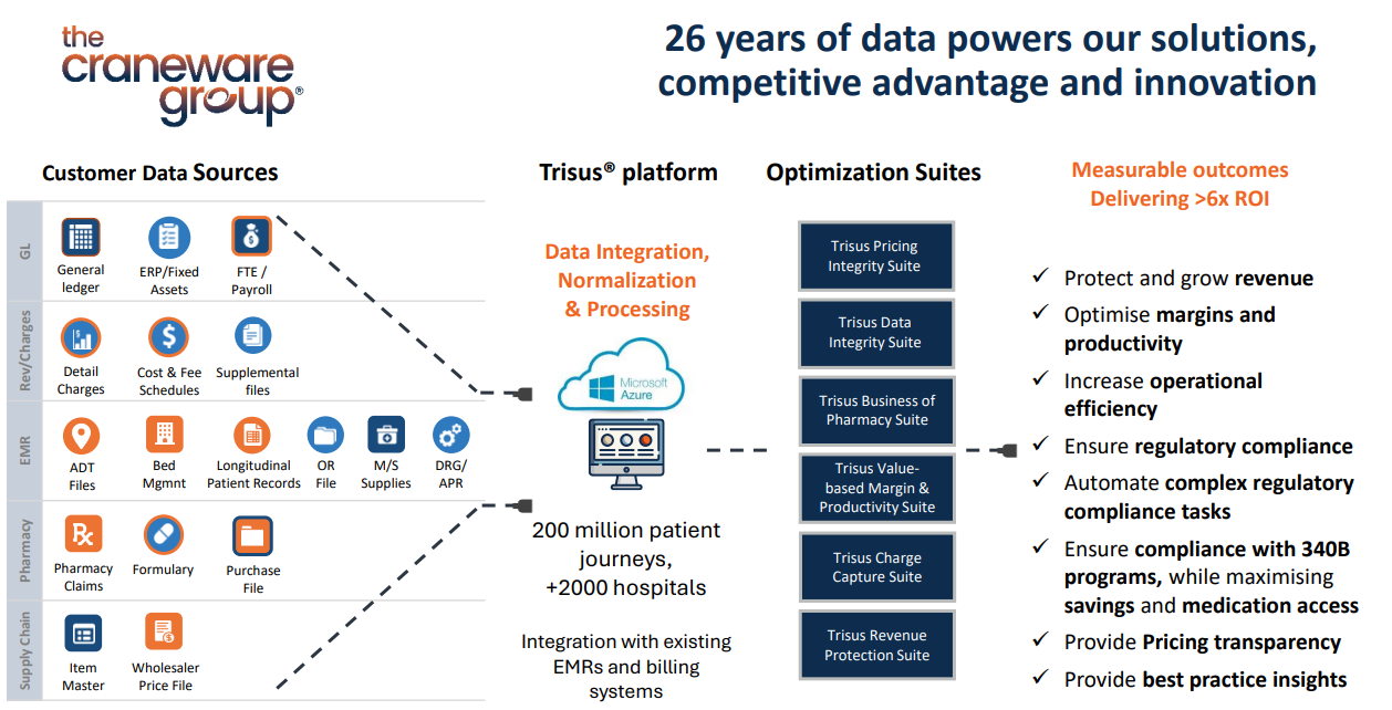 Management have already announced a partnership with Microsoft, to implement AI through the group’s Trisus platform. Around 40% of US hospitals are customers, which spend almost a trillion dollars, so CRW costs are a tiny share of overall hospital operating expenses, the risk from switching to a more disruptive platform seem to greatly outweigh any cost saving benefits. In addition CRW software is hard-coded into the hospital’s financial ledger, so unlike a company like LSEG where company data is publicly available, Tirsus operates behind hospital firewalls. No LLM can “scrape” a hospital’s internal pharmacy spend and an agent can’t interface with a hospital’s billing system without the underlying protocols Craneware provides.