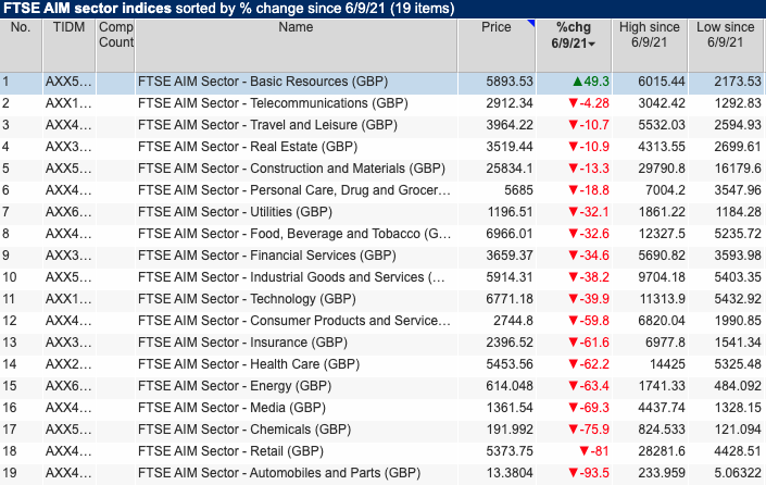 Since Sept 2021 the only Industry in positive territory is Basic Materials (ie mining and oil, and within that Precious Metals and Mining sector) up +49%. Individual names such as Empire Metals, Metals Exploration, Borders & Southern Petroleum, Rockhopper and Strategic Minerals are all resource extraction. The only stock I own in that list above is MS International, the defence group, which I bought well before the pandemic. Below we can see that 7 AIM sectors, including Retail and Media have had a terrible time, down -60% or more. Even though the Nasdaq 100 is up +60% since Sept 2021, the AIM listed Technology sectors has struggled, down -40%.