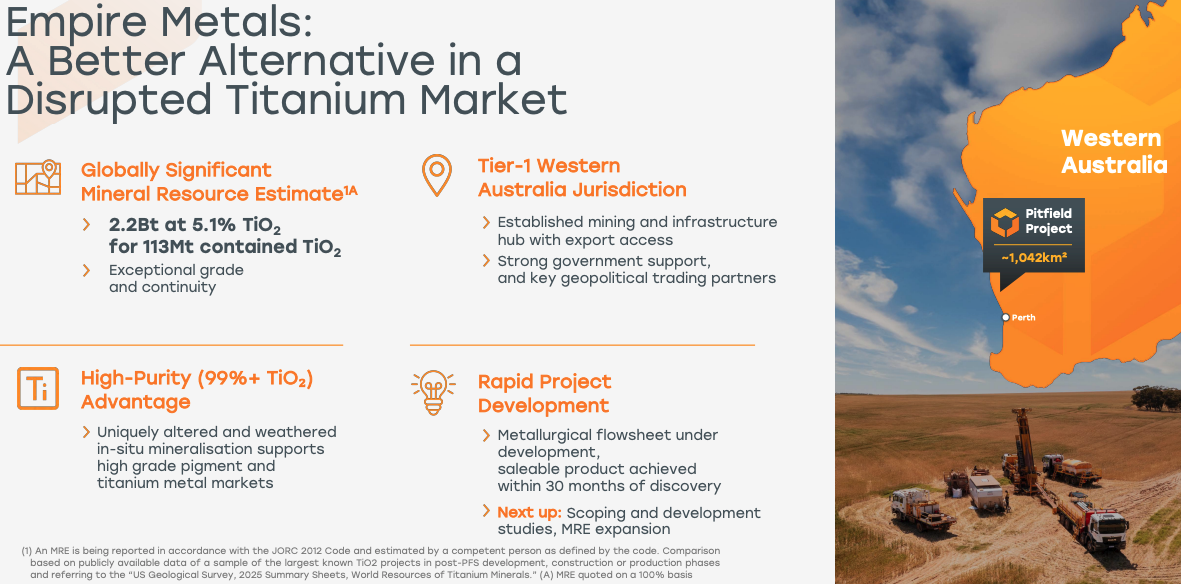 Empire Metals was even more fortunate. The original investment case was based on finding copper in Western Australia. By accident, they discovered the Pitfield Titanium Project in Western Australia which drilling revealed to be a giant titanium mineral system.