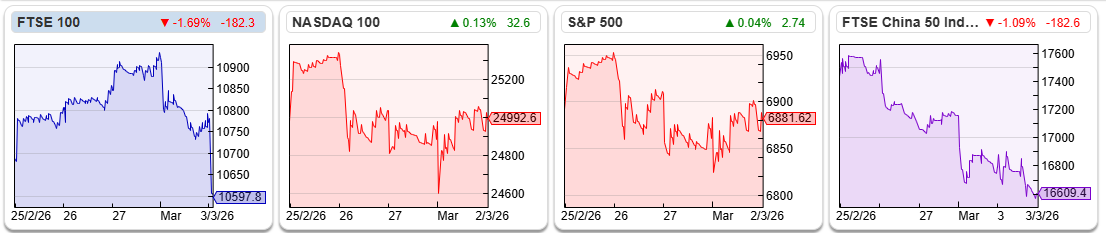 The FTSE 100 fell -1% but remained above 10,000 over the last 5 trading days. The Nasdaq100 was up +1%, while the FTSE China 50 fell -4.6%. Brent Crude was up +14% as conflict between US, Israel and Iran closed the Straits of Hormuz. Qatar shutdown LNG at world’s largest export facility after it was targeted in an Iranian drone attack.