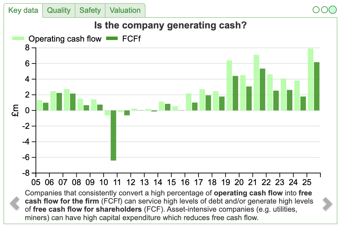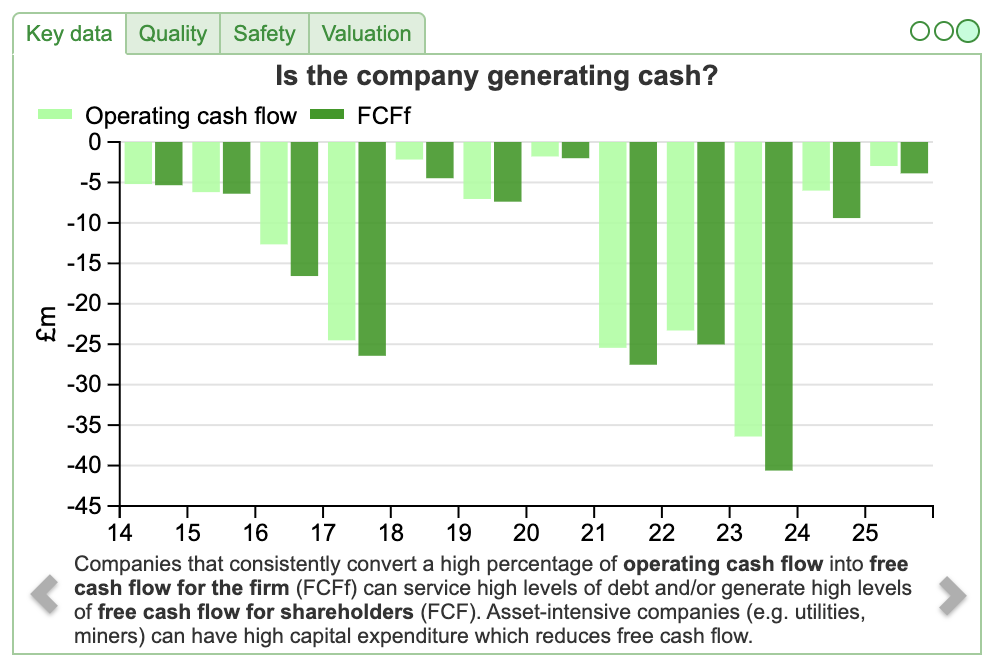 That $49m represents +54% sales growth versus the previous year. The group is still loss making, $17m (down from $26m FY Dec 2024). If anything those loses understate financial performance, as management capitalise some R&D expense on to their balance sheet ($19m of intangible assets), which reduces the costs expensed through the p&l. Sharescope shows that the company hasn’t been generating cash, yet the FCFf and Operating cash flow have improved from deeply negative in the last couple of years towards breakeven. Hopefully that improving trend can continue into the future.
