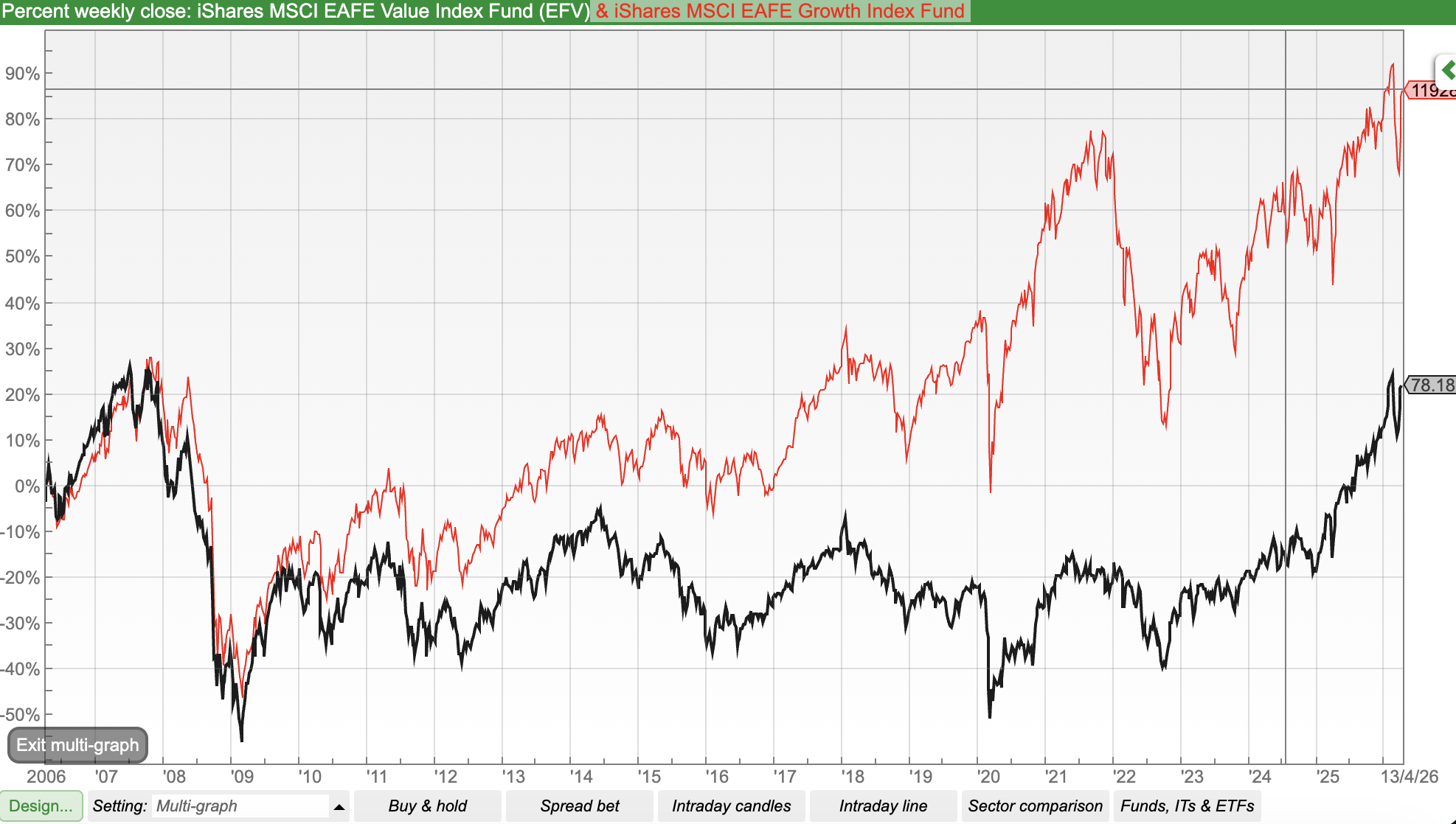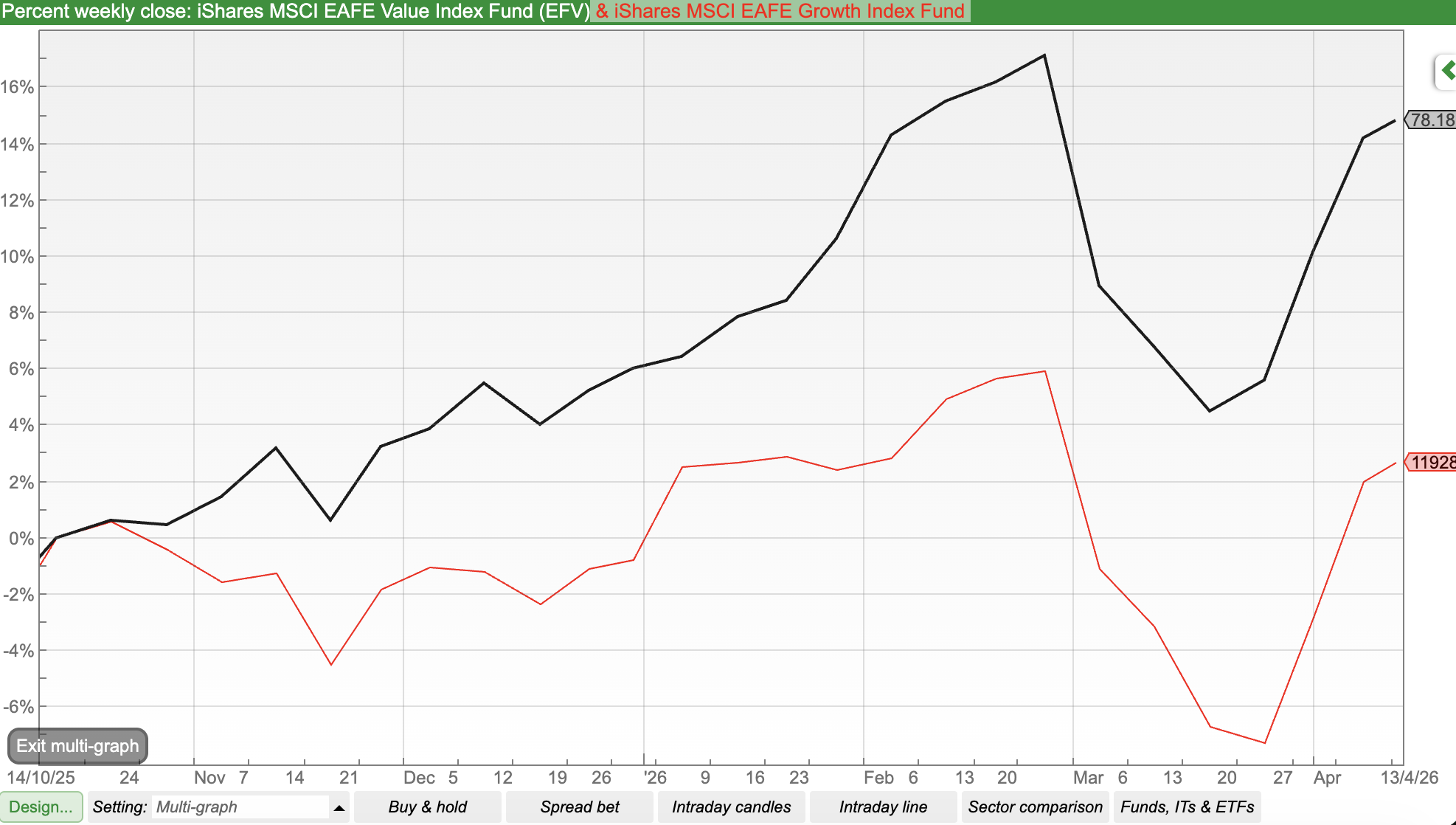 I mostly invest in individual UK shares, but one benefit of ShareScope that I find very useful is the ability to look at various commodities (oil, copper) and ETF indices (MSCI World, TLT 20+ Year US Govt Bond). Below are a couple of charts comparing the MSCI EAFE (Europe, Australasia, and the Far East – that is, developed markets outside the USA) Growth versus Value over different timescales. I show the six month graph, showing that Value (in black) has begun to outperform Growth (in red) then further below the long term chart.