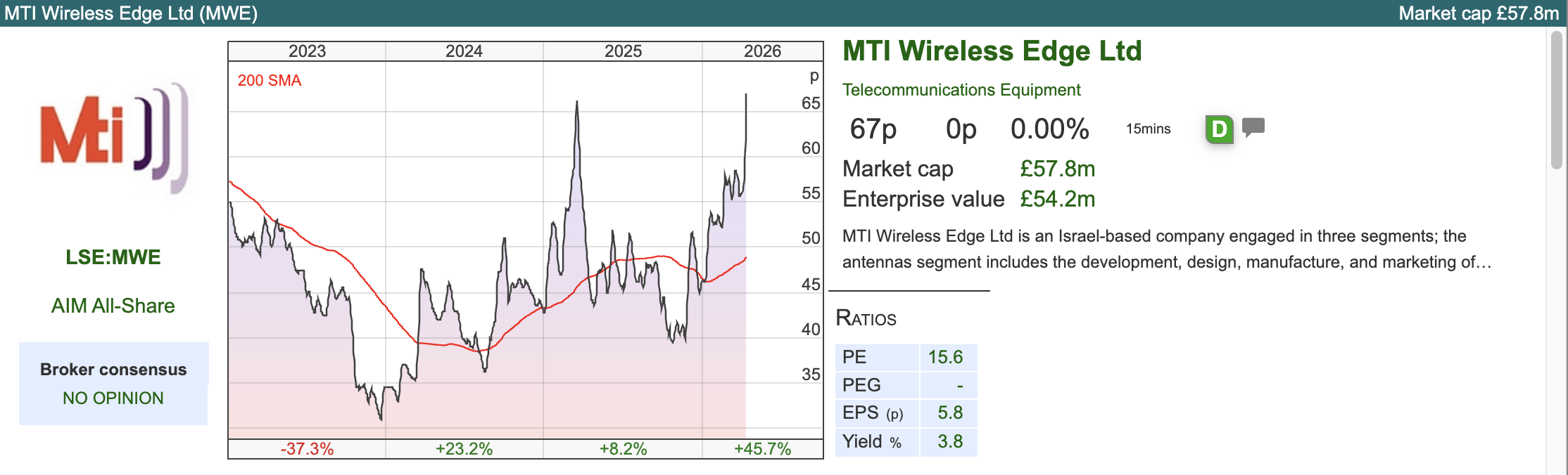 This Israeli headquartered radio frequency company has benefited from increased defence spending, winning orders equivalent to over 10% of FY Dec 2025 annual revenues (which were $52m). They give a split of the orders, i) $2.2m contract to supply communications infrastructure to the Israeli Ministry of Defence; ii) a $1.9m contract to supply military antennas to an international defence company; iii) a US$0.5m contract for military antennas from a local defence company; and iv) additional orders $1.3m again for a defence company. Then at the start of this week, they put out another RNS saying that their antenna division has yet another order for $2m for a local defence company.