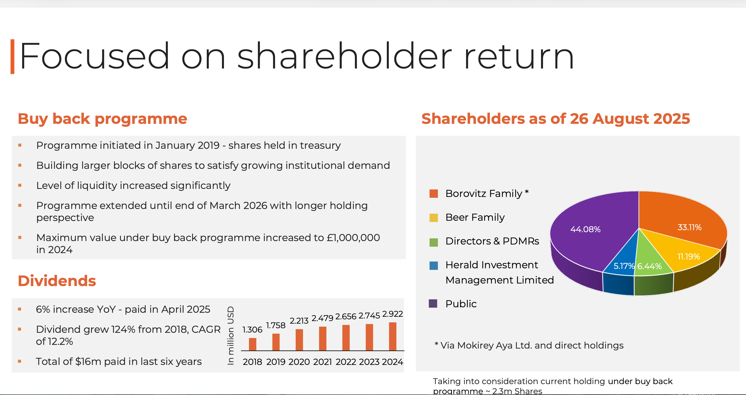 I am normally wary of Israeli groups listed on AIM, but this has been listed on AIM since 2006, which is reassuring. ShareScope also shows (above) that there’s a long history of Free Cash Flow generation too. There are a couple of large blocks of shareholders, including the Borowitz family who own a third. As the founder, Zvi Borowitz died a few months ago, this may create an overhang.