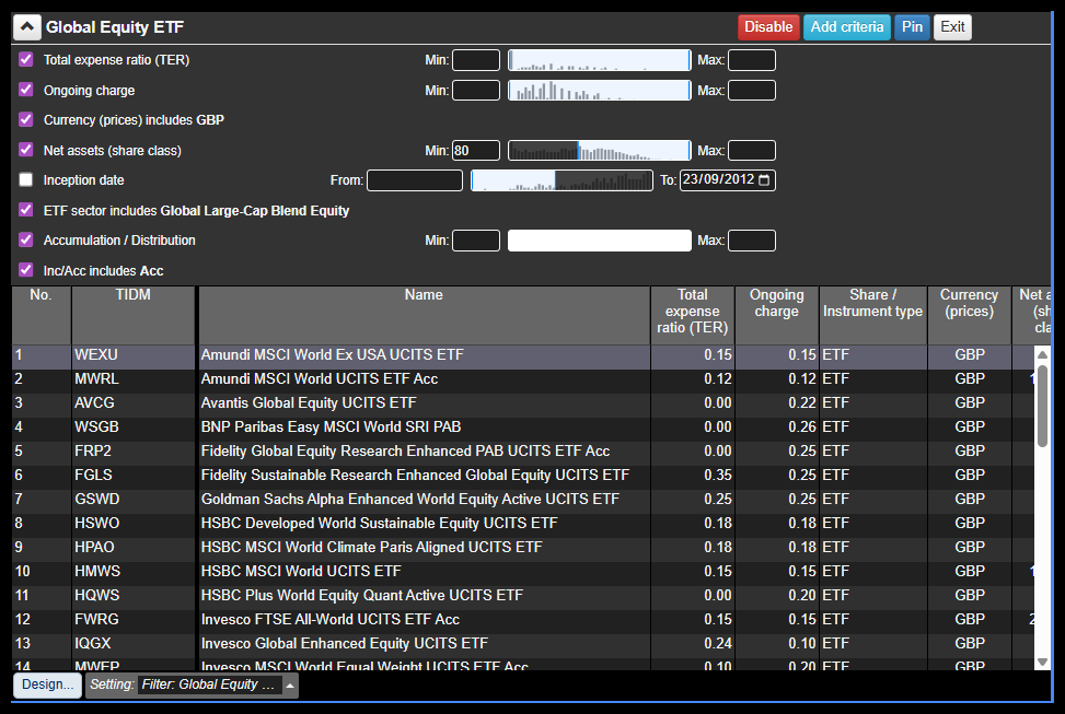(You can run this screen for yourself by selecting the “PensionCraft – Global Equity ETF” filter within ShareScope’s Filter Library.)