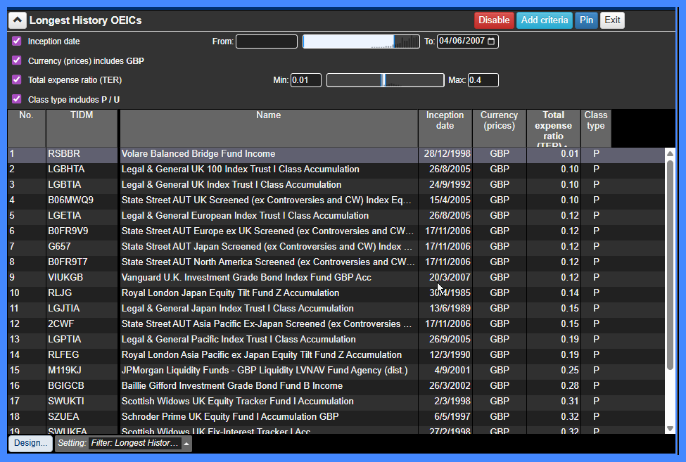 Let’s say I want to find the OEICs with the longest histories for back-testing. That now becomes trivial. I set up a filter that includes “Inception date”, “Currency (prices)” which I choose to include GBP, Total Expense Ratio (TER) and Class type where I choose to include “P”. I can then sort the results by inception date to get the oldest retail funds available to UK investors. I’d usually also set a maximum expense ratio of 0.4% as I would only pay more than this for very special funds that offer something unusual.